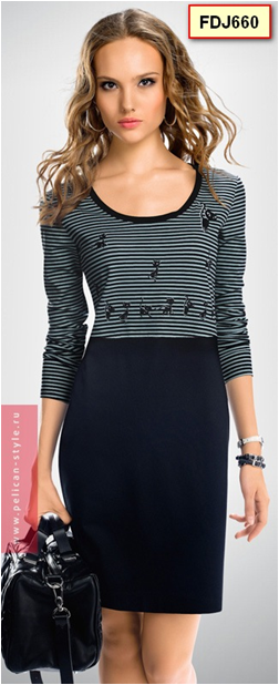 Платье для смелых натур, которые не боятся смешивать стили и быть не такими как все: жесткая контрастная полоска комбинирована с силуэтами милых котиков и романтичной имитацией застежки на спине.