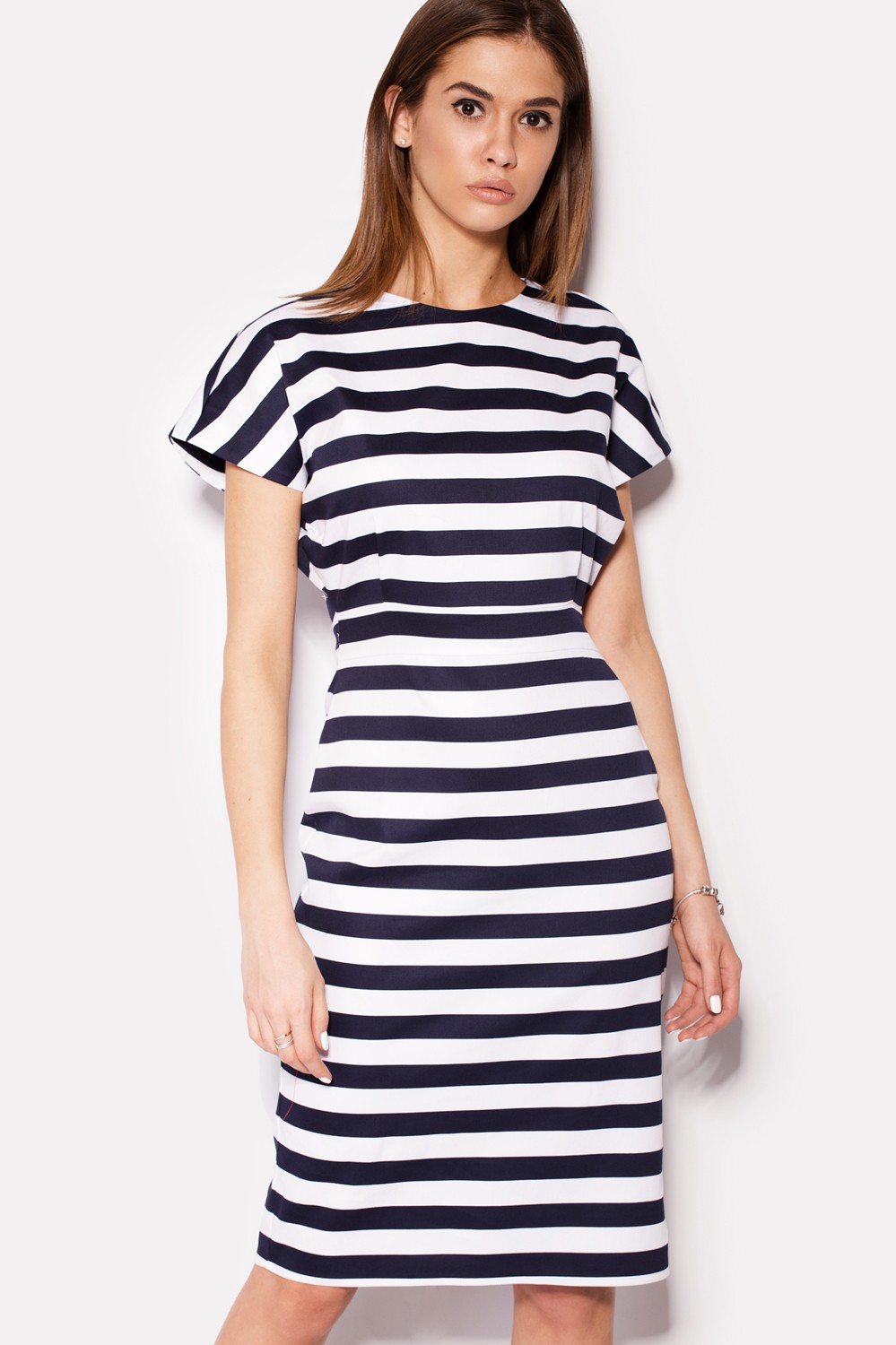 Коттоновое белое платье MAGNUM в темно-синюю полоску средней ширины. Платье в легком фасоне с привычной потайной молнией на спинке, аккуратными рукавчиками короткой длины и разрезом сзади на юбке. Состав ткани: 60% хлопок, 40% полиэстер.