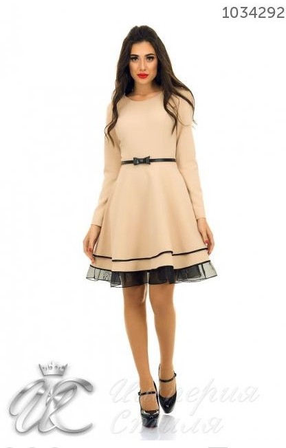 Бежевое платье с ярусной юбкой+ремень эко-кожа с бантиком.