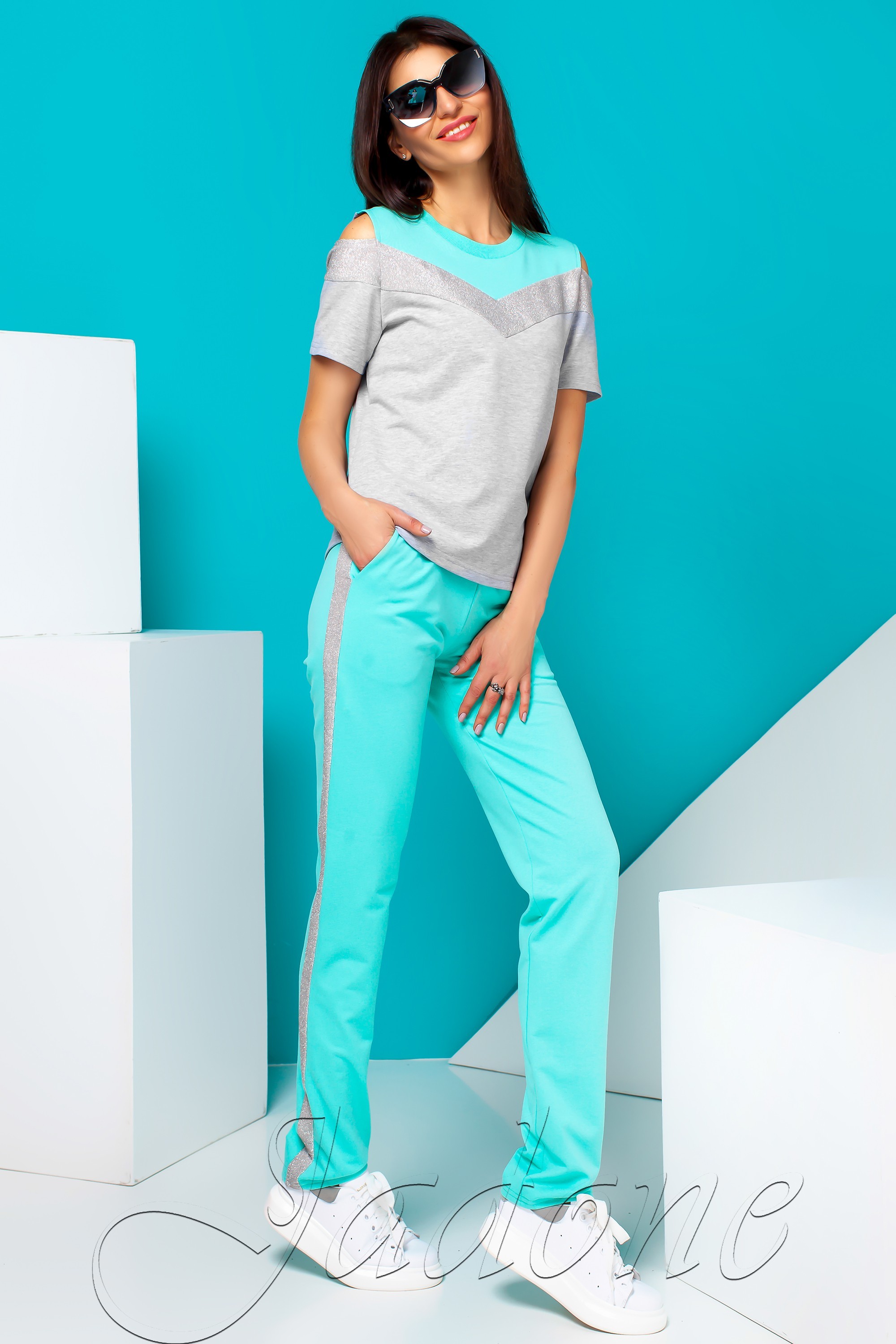 Стильный прогулочный костюм из двунитки, декорирован вставкой из люрекса на кофте и лампасами на брюках. Костюм выполнен в классическом стиле без манжетов на рукавах и брюках. Подойдет как для занятий спортом, так и для городских прогулок. Ярким акцентом модели является дизайнерское решение – оголенное плечо.