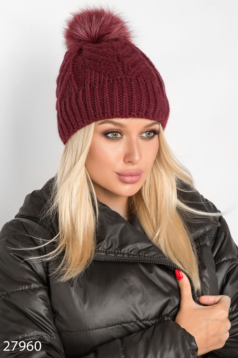 Вязаная шапка с помпоном и дополнительным флисовым подкладом с изнаночной стороны.