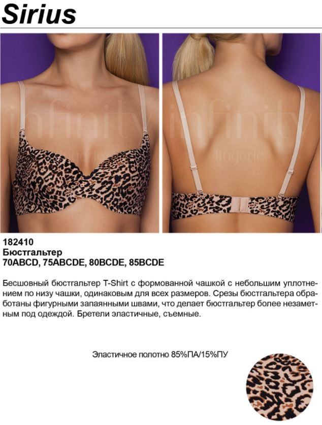 Бесшовный бюстгальтер T-shirt с формованной чашкой с небольшим уплотнением по низу чашки. Срезы бюстгальтера обработаны фигурными запаянными швами, что делает его незаметным под одеждой. Бретели эластичные, съёмные.