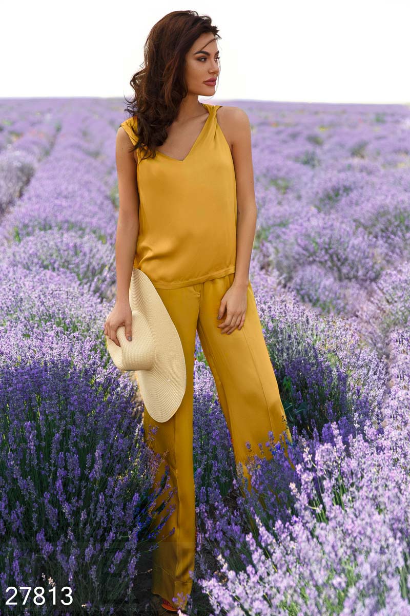 Летний костюм из струящейся ткани: свободный топ с драпировкой и брюки-палаццо средней посадки с двумя карманами по бокам.
